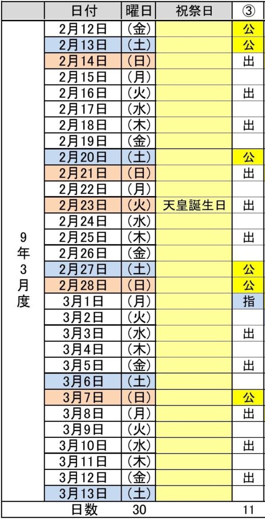 令和9年3月度(2/12~3/13) 3パターン