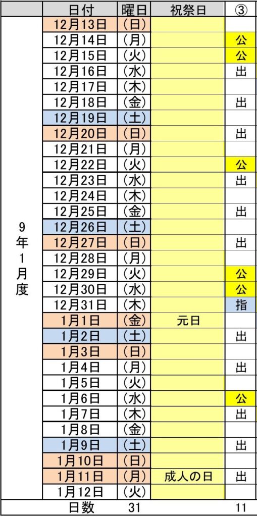 令和9年1月度(12/13~1/12) 3パターン
