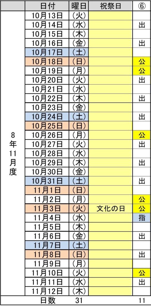 令和8年11月度(10/13~11/12) 6パターン