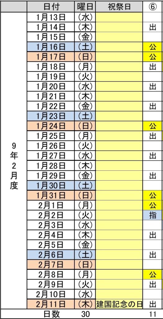 令和9年2月度(1/13~2/12) 6パターン