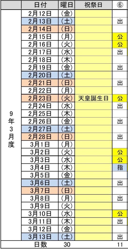 - 令和9年3月度(2/12~3/13) 6パターン