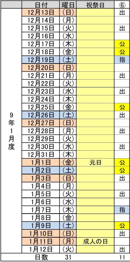 令和9年1月度(12/13~1/12) 6パターン