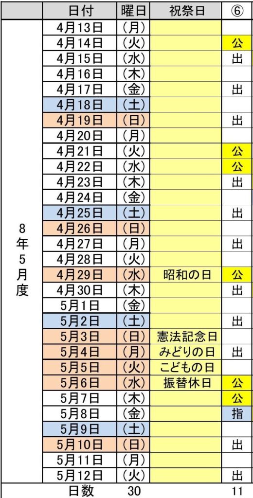 - 令和8年5月度(4/13~5/12) 6パターン